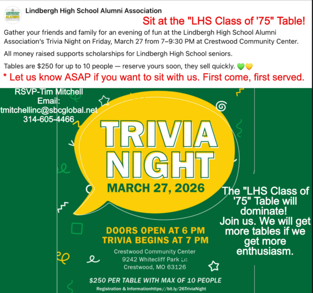- Friday March 27 Trivia night for Lindbergh High School Alumni Association